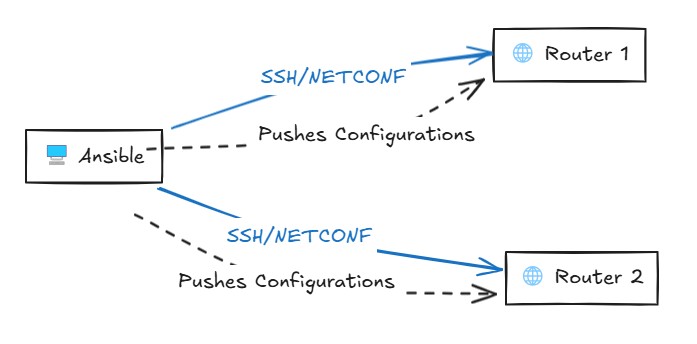 Diferente da automação de servidores, onde comandos rodam localmente, na automação de rede: