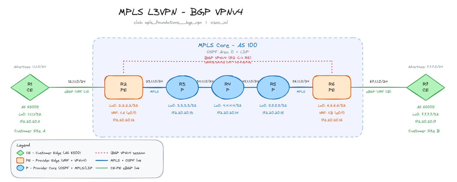Neste laboratório você vai configurar uma rede MPLS L3VPN de ponta a ponta, simulando um cenário real de provedor de serviços. A topologia possui dois clientes (CE R1 e CE R7) que precisam se comunicar através do backbone MPLS do provedor (R2 a R6).